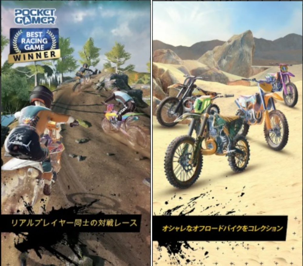 オフロードのダートコースで競い合うリアル系のバイクレース。レースでコインを入手してマシンをカスタマイズ、グローバルランキング1位を目指すゲームです。アバターは、名前や着せ替えはもちろんキメポーズまでカスタマイズできます。