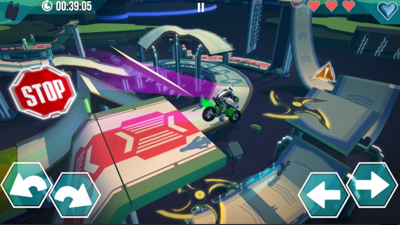バイクを転倒させないように注意して、コインを集めながら障害物を超えていくゲームです。レースというよりはトライアル。比較的簡単にプレイできるので、未経験の方にとくにおすすめです。とはいえギミックが隠されたステージや、コツを掴まないとクリアできないステージもあります。操作はアクセル・ブレーキ・ニトロの速度と、ジャンプと姿勢の制御。転倒しないためには姿勢制御をマスターしましょう。なお操作方法は選べます。