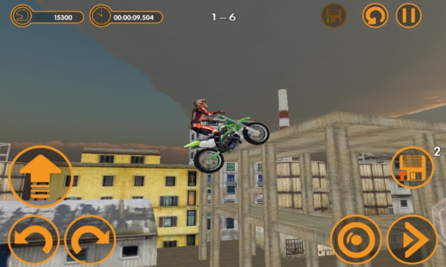 建物の屋根の上や街中に作られたコースで、ドラム缶や廃車・大型タイヤなどの障害物を乗り越えていくモトクロスのゲーム。他車と競うレースではなく、技術を駆使しての時間との戦いです。前輪を浮かせたり車体を持ち上げたりと、障害物を乗り越える細かなテクニックやバランス感覚も求められます。操作法は設定で選べるので、得意な方法でチャレンジしましょう。