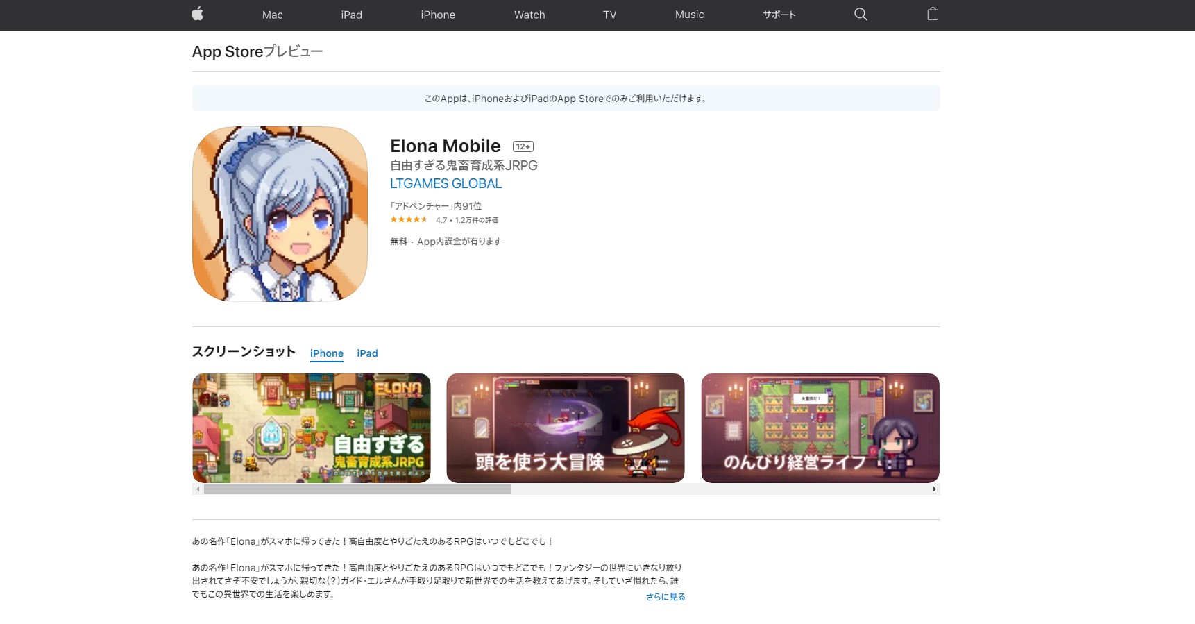 | 公式サイト | https://apps.apple.com/jp/app/elona-mobile/id1512936641 |