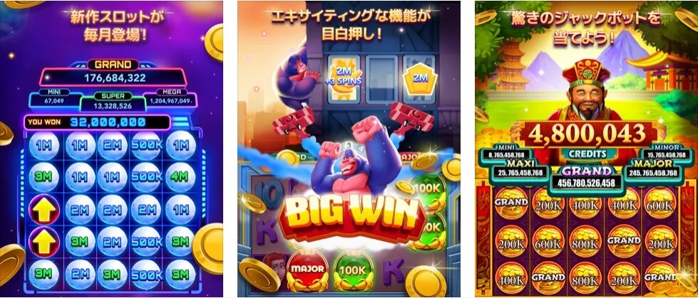 初心者に優しく、目押しなどは一切ありません。それでいて演出はしっかりとカジノにいるような雰囲気を味わえるため、本格的なスロットを求める方も満足できるでしょう。また、多種多彩なボーナスゲームが用意されているので飽きることなくプレイすることができます。毎日ログインでボーナスコインもしっかりもらえ、コツコツプレイしてコインもしっかりと稼げます。