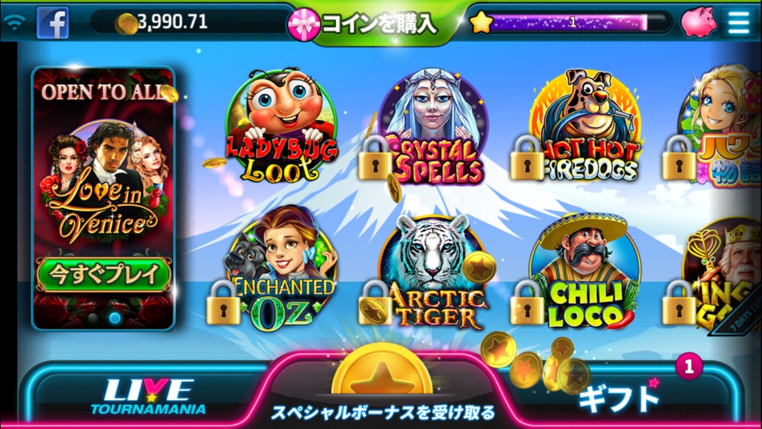 また、ゲーム内のさまざまなミッションをクリアすることによって、ボーナスコインを入手でき、さらぶ毎日のログインボーナスやデイリールーレット、毎時間ごとのスロットボーナスなどコインを稼ぐチャンスも豊富にあります。