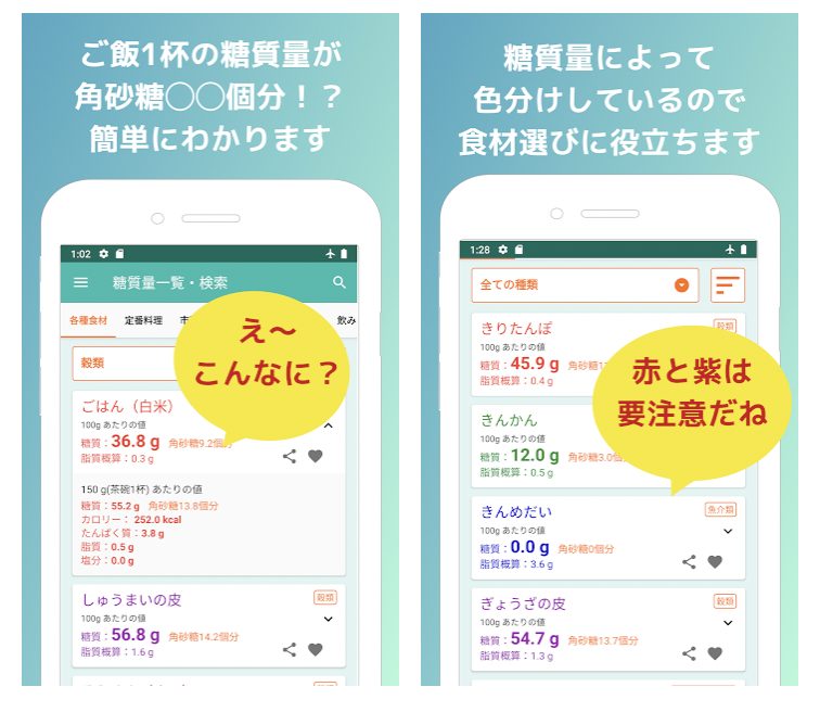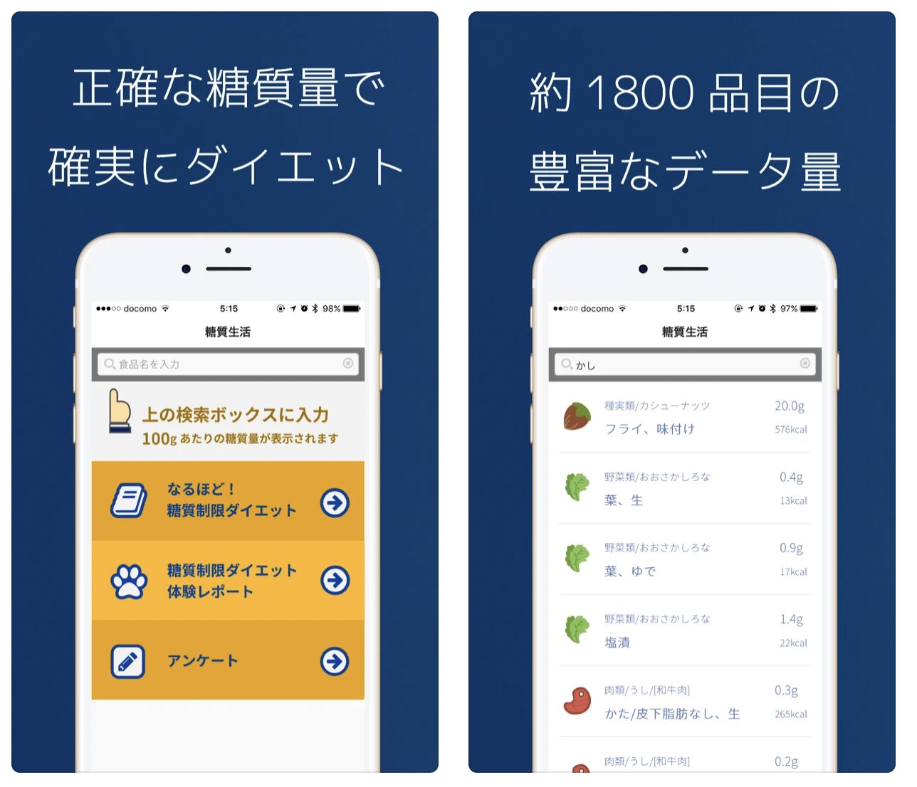 文部科学省が発表した「食1800品目の食品成分表」から、糖質量とカロリーを手軽に検索することができます。運動や食事制限をいきなり始めるより、自分が日常的にどんな食事を食べて、どんな食材が使われているか把握することで、摂取する糖質量のトータルは大きく変わるため、糖質の把握から始めるのがお勧めです。雑誌や各種メディアでも取り上げられているため、多くの人が使用しています。