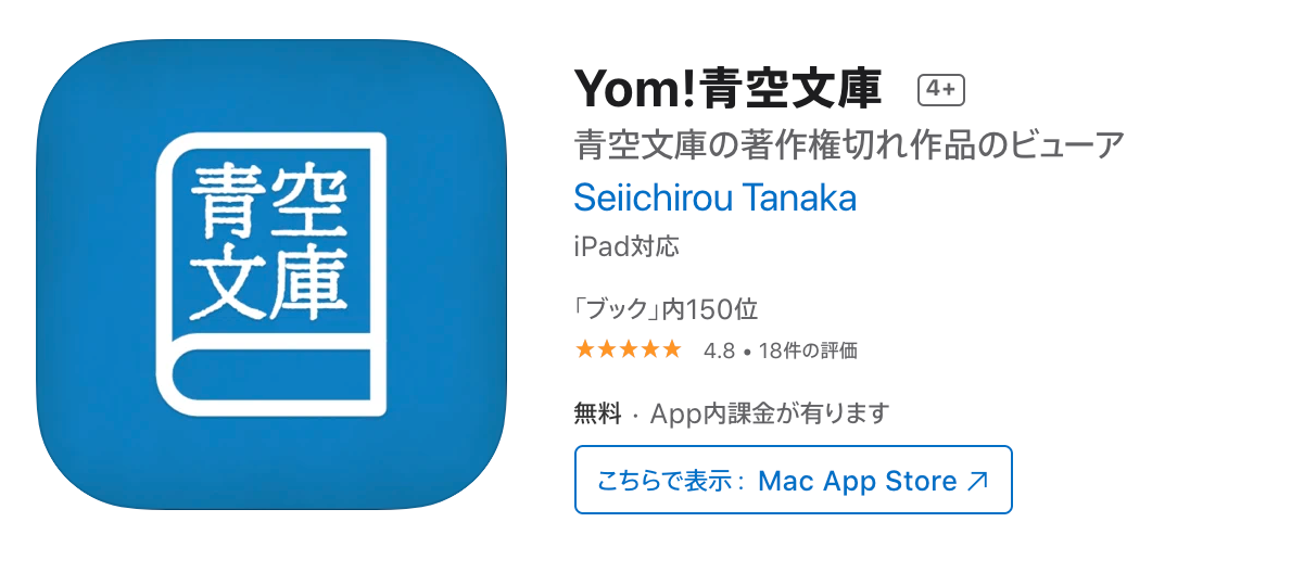 | Yom!青空文庫 | ★★★★★ | 無料 | 著作権が消滅した過去の名作小説を無料で読むことができる! |