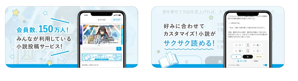 | エブリスタ | ★★★★★ | 無料 | 小説をサクサクよめるように自分好みにカスタマイズできる! |