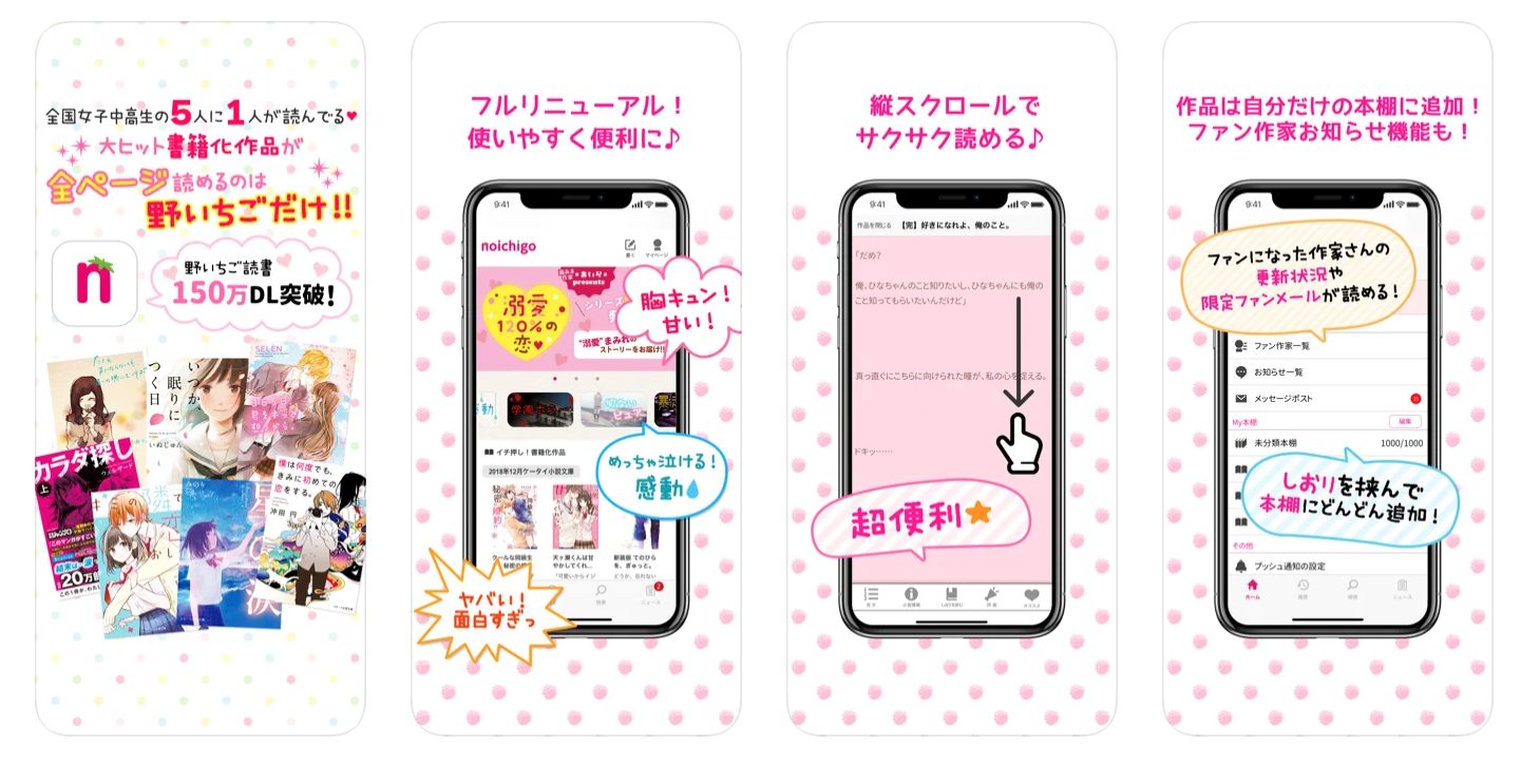 女子中高生に絶大な人気を誇る小説アプリです。話題の小説を読んだり、自分で書いた小説を投稿したりできます。胸キュン小説や泣ける小説など、女子中高生はもちろん、小説好きな大人女子も楽しむことができますよ。ホーム画面では話題作品がジャンルごとに掲載。タップすると詳細を読むことができますので、作品選びにとても便利です。各品は縦スクロールでサクサクと読むことが可能です。SNSでのシェアもできますので、気に入った作品は友達と共有して楽しめます。