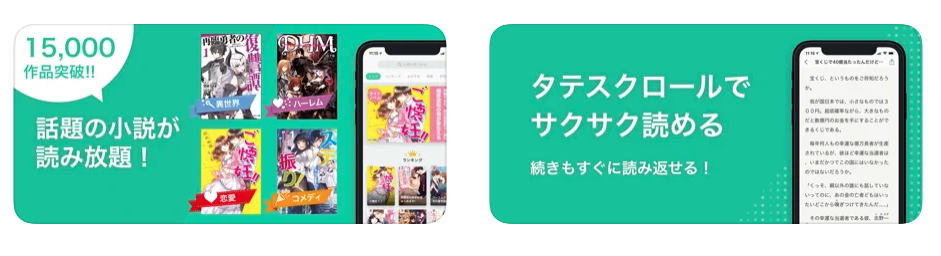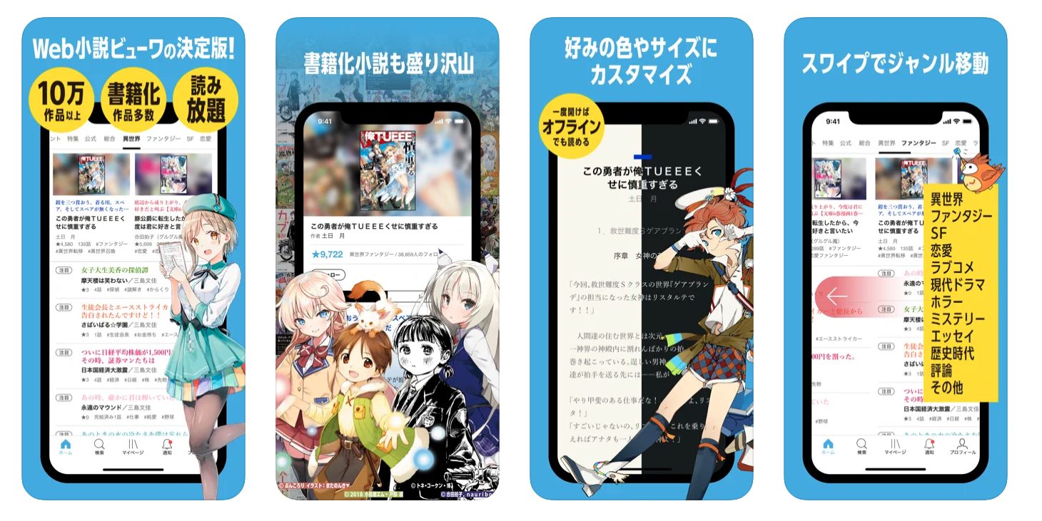 オリジナル作品をフルカラーのイラストつきで読むことができる小説アプリです。基本的に、ユーザーが投稿した小説がメインで、ジャンルは異世界ファンタジーや冒険、ラブコメなどと幅広く配信しています。プロの作家ではなく一般の人からの投稿ですが、かなりレベルが高く読みやすくハマります。自分で書いた小説を投稿スルことも可能ですので、小説家になりたい人や書籍化デビューしたいという人にもおすすめのアプリです。実績に応じて報酬があるのもポイント。