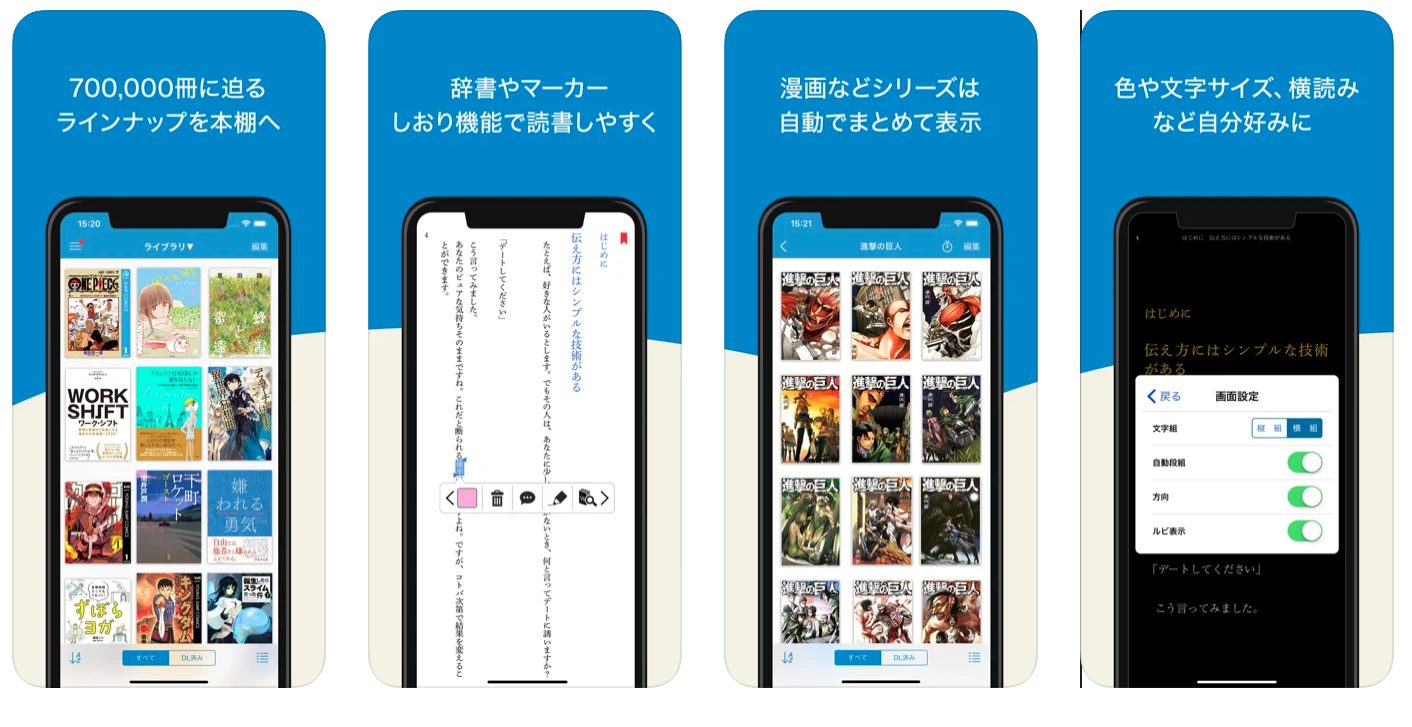 国内最大級の書店チェーンの紀伊国屋書店が運営する、書籍・ブックストアアプリです。インターフェースが紀伊国屋書店のブックカバーのようなのが、小説好きにはたまらないでしょう。オフラインでの読書、マーカー機能、しおり機能など、読書を快適にする機能が満載。スマホとタブレットなど複数の端末で共有できるので、外ではスマホ、家ではなどと使い分けが可能です。また、国内最大の書籍チェーン店ならではの豊富な品揃えが嬉しいポイント。