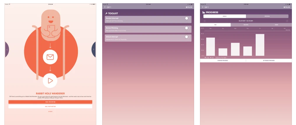 このアプリは、スマホの利用状況を計測し、そのスコアを表示することでスマホ依存度を測ります。そのスコアに応じて、そのアプリでの成果を取得、その積み重ねによりスマホ依存からの脱却を図ります。このアプリでは、他の同様のアプリとは違い、スマホの通知やネットの通信を制限することで、作業への集中を促します。このアプリを使い続けることで作業に集中する習慣をつけ、結果としてスマホ依存から抜け出すことに繋がります。