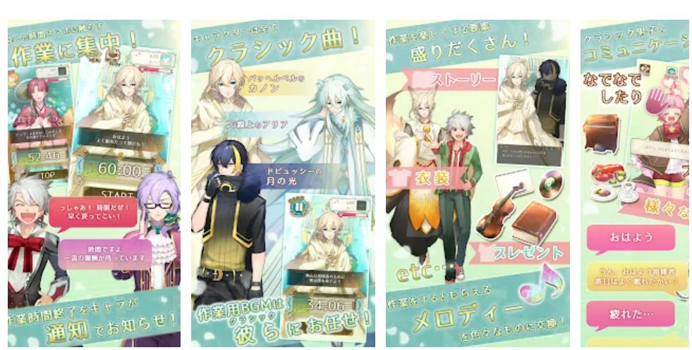イケメン男子に擬人化されたクラシックの名曲が奏でるメロディーに作業が捗る、集中タイマーアプリ。作業に集中することによってスマホ依存も抑止してくれます。タイマーに設定された時間、メロディーで作業に集中させてくれるだけでなく、作業完了後にはキャラクターによるご褒美など、エンタメ要素もたっぷり。キャラクターと親密になったとき、作業を頑張ったときに得られるアイテムで、キャラクターのストーリーが開放され、ゲームの幅が広がります。ただの集中タイマーアプリではない、キャラクターとの融合が新鮮!