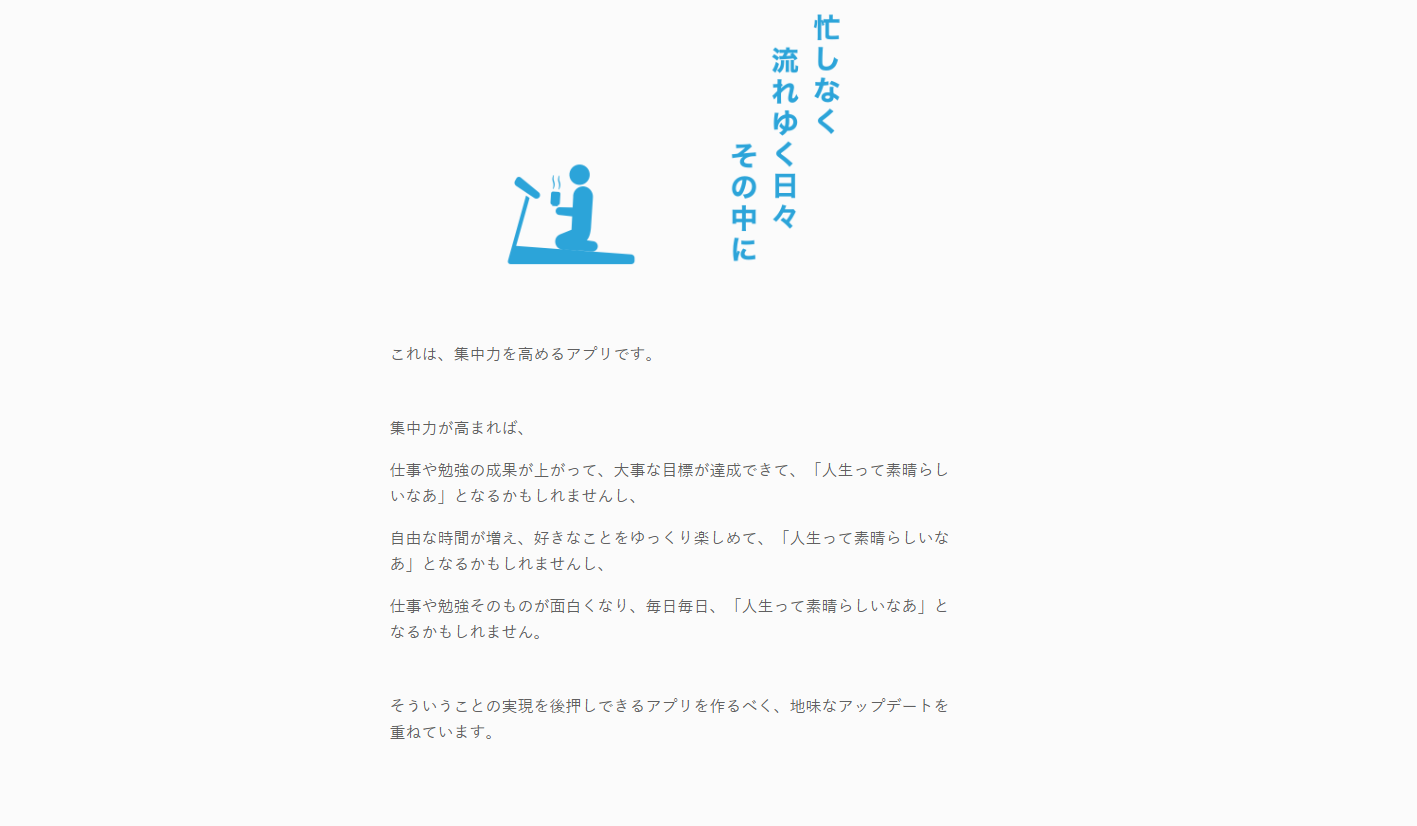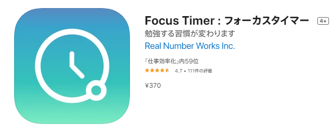 | 公式サイト | https://apps.apple.com/jp/app/focus-timer-%E3%83%95%E3%82%A9%E3%83%BC%E3%82%AB%E3%82%B9%E3%82%BF%E3%82%A4%E3%83%9E%E3%83%BC/id974920073?mt=8 |