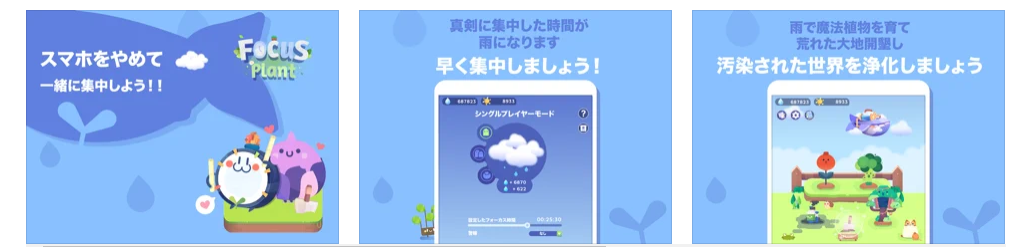 このアプリは、作業に集中することでスマホの操作をさせないようにし、その間に植物を育てる、育成型の集中タイマーアプリです。スマホを使わずに放置している間に、雨が降るなどして植物が育っていきます。