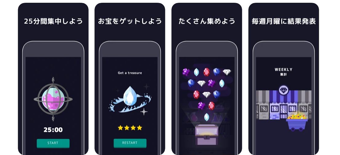 このアプリは、25分間のタイマーを設定し、その間はスマホを操作しないことによってお宝がもらえる、スマホ依存対策アプリです。他のアプリと違い、25分間という時間のみの設定となりますが、その時間の区切りが、継続しやすく最適な時間といえます。より多くタイマーにより集中することで、よりレアリティの高いアイテムを入手することができるため、継続のモチベーションに繋がり、結果としてスマホ依存からの抜け出すことに繋がります。
