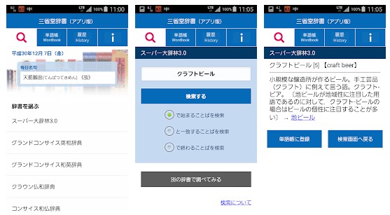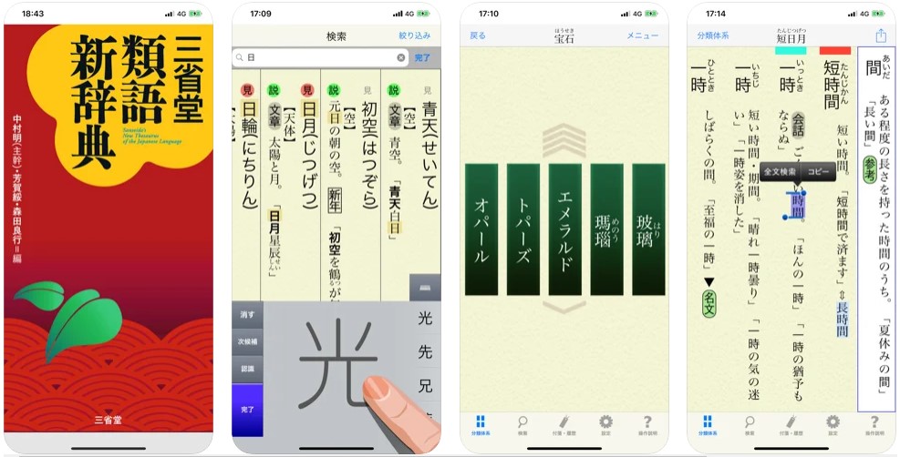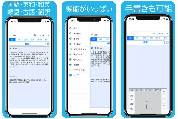 大手出版社である三省堂が出しているアプリです。先程ご紹介した「三省堂 類語新辞典」は類語辞典のみでしたが、こちらのアプリでは『必携類語実用辞典』をはじめ、国語、英和、和英、ことわざ、カタカナ、フランス語、中国語など、さまざまな辞典を利用することができます。ダウンロードは無料で、月額330円で利用することが可能です。紙の辞書の内容はそのままに、アプリならではの検索性を向上。「部首検索」や「画数検索」も可能です。