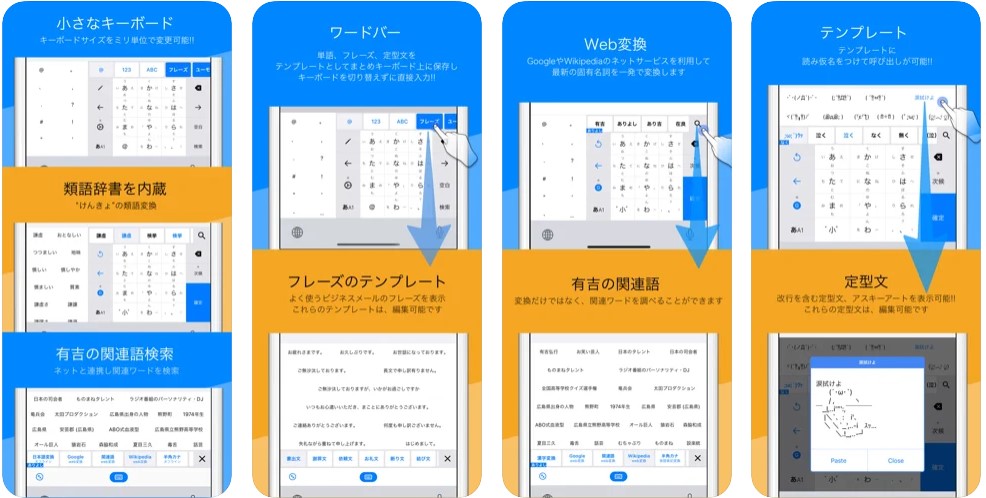 ワードライトは類語辞典を内蔵したキーボードです。類義語変換にも対応。よく使う単語や言い回し、定型文をキーボード上に保存することも可能。スマホで文章を書いているときにすぐに検索できるのが魅力的です。サジェスト変換や関連ワード検索機能なども搭載。入力のスピードアップにも貢献します。フリックキーのカスタムやキーボードサイズの変更など、カスタマイズ性も高く、自分が使いやすいように調整することができます。