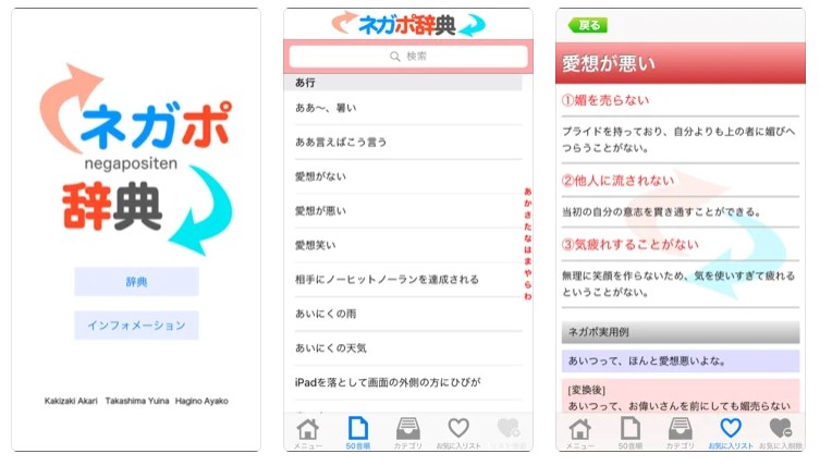 2010年秋、全国高等学校デザイン選手権大会(通称デザセン)で全国3位に入賞したアイディアがアプリ化されました。ネガティブな言葉を入力することで、ポジティブな表現への言い換えを提案してくれます。たとえば「愛想が悪い」というキーワードを検索すると、「媚を売らない」「他人に流されない」といった表現方法が表示されます。女子高生が考えた"心のアプリ"。文章作成はもちろん、SNS投稿や友達とのやり取りなどで表現に迷ったときなど、さまざまなシーンに活用できます。