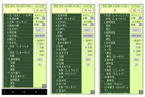 類義語や連想語を一覧で表示してくれるアプリです。10万語もの言葉が収録されていて、さまざまな類義語を見つけることができます。自分で考えるだけではなかなか思い浮かばない表現方法や発想の転換など気付きがあり、小説や作詞などのヒントも見つかります。シンプルなインターフェイスですが、部分一致や先頭一致、後方一致や完全一致など、さまざまな検索方式に対応。緑を基調にした落ち着いた目に優しいUIも使いやすいです。