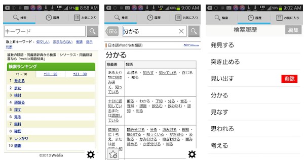 検索エンジンを使った辞書アプリです。類語辞典はもちろん、国語、和英、英和、古語、翻訳などさまざまな辞書機能が使えます。手書き検索で読み方がわからない漢字も検索可能。プレイボタンを押すことで検索した単語の発音を聞くこともできます。1台のスマホで複数の辞書が使えるので、非常に便利。類語辞典だけでなくその他の辞書を使いたい方にもおすすめ。それでいて操作性がシンプルなので、どなたでも簡単に扱うことができるのも魅力です。