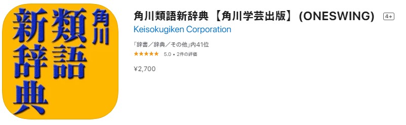 | 角川類語新辞典【角川学芸出版】(ONESWING) | ★★★★★ | 2,700円 | 49000語の日本語を収録 |