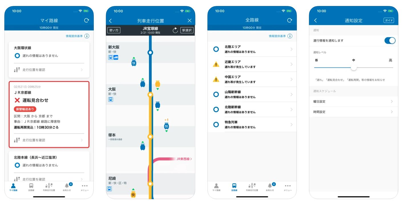 JR西日本が配信する公式アプリです。時刻表の他、運行状況や列車の走行位置なども確認することができます。JR西日本の在来線や新幹線や特急列車を登録しておけば、15分以上の遅延が発生した場合は、プッシュ通知でお知らせしてくれます。運行状況によって3段階の通知レベルを設定することができますので、ライフスタイルに合わせて、曜日設定や時間設定などの詳細な通知を設定することが可能です。JR西日本の列車を利用するなら、ダウンロードしておいて損はありません。