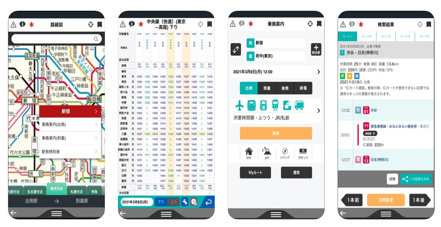雑誌「JR時刻表」や「MY LINE東京時刻表」をベースにした時刻表アプリです。今までのように本をめくって調べていた時刻表が、アプリで瞬時に解決してしまいます。検索機能が充実していて、駅のナンバリングや路線カラーなどの表示でスムーズな移動を可能にしました。運賃表示は、きっぷ運賃やICカード運賃はもちろん、定期料金の「表示も可能。また、SNSで簡単に共有することができますので、待ち合わせの際に便利です。(TwitterやLINEの公式アプリが必要です)